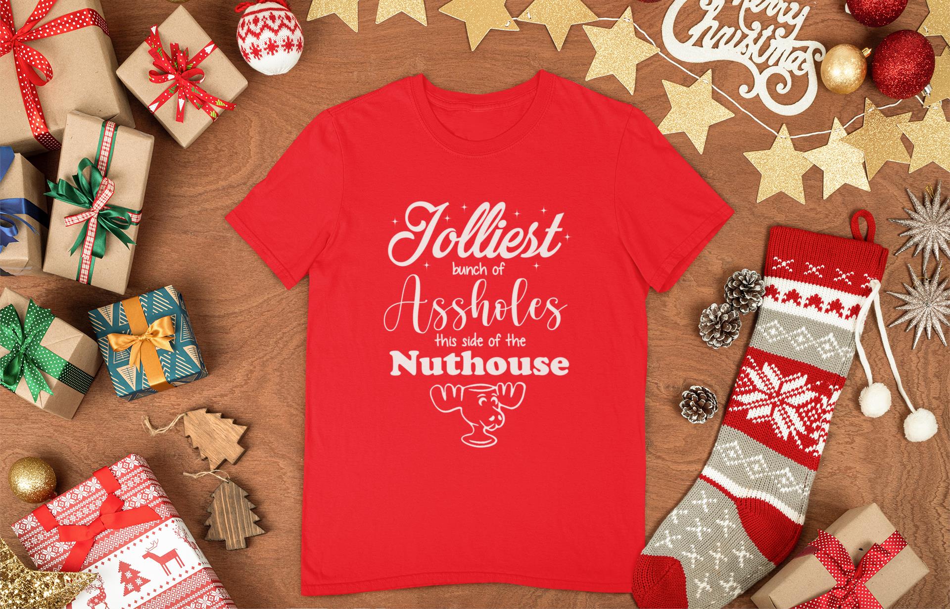 Jolliest Bunch of Assholes this side of the Nuthouse...one of the best phrases to come out of a Christmas Movie ever. Perfect Christmas T-shirt for fans of 80's Movies. Great Christmas gift.
